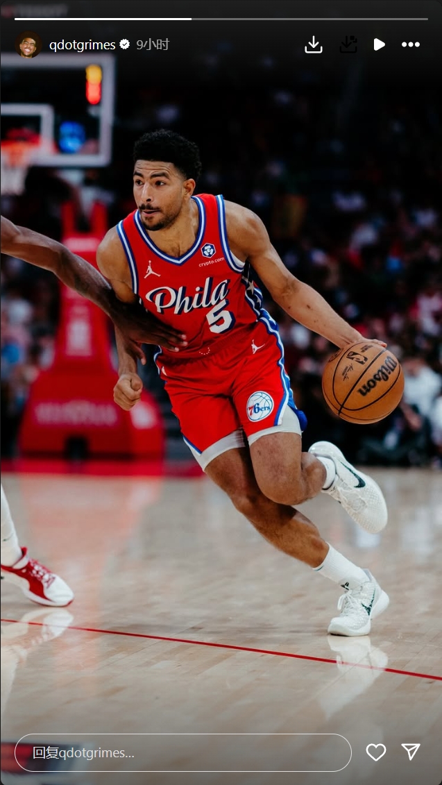 格莱姆斯在9个小时前突然在Instagram更新了一则动态,晒出了一张自己上赛季身穿76人球衣的赛场照。